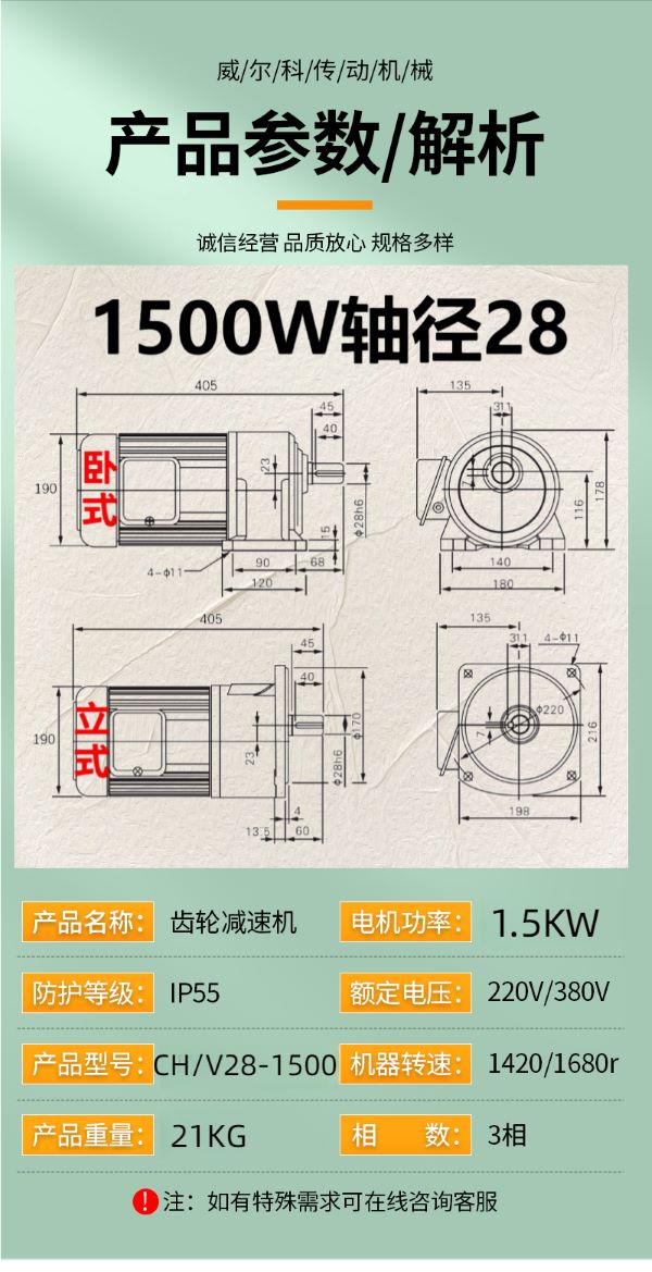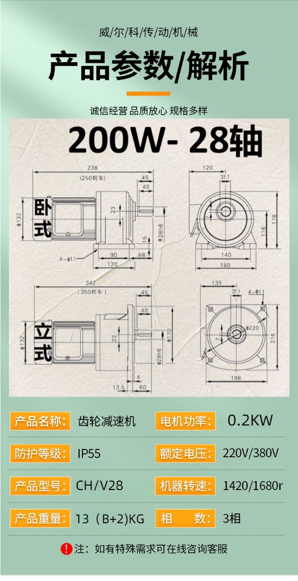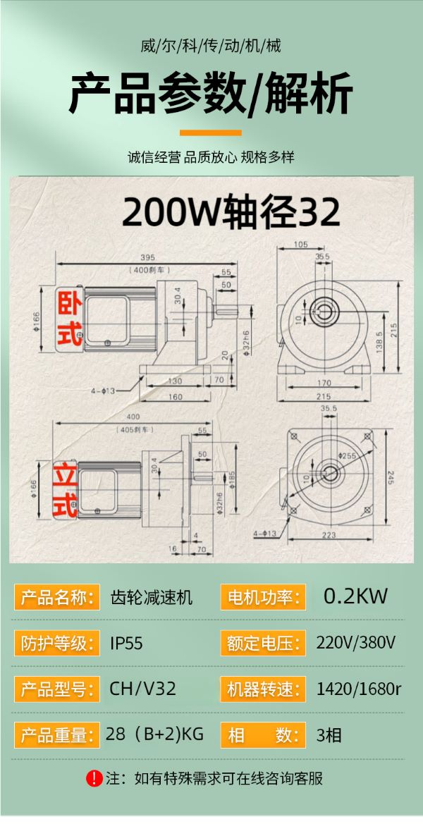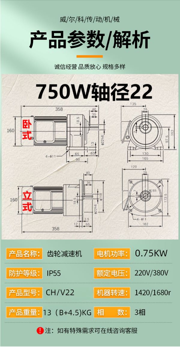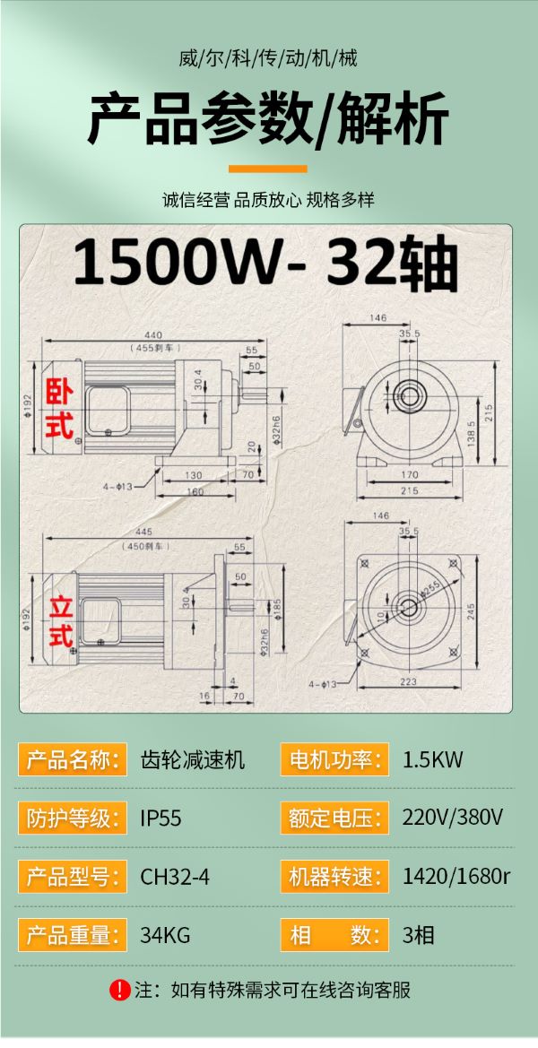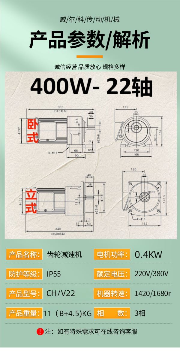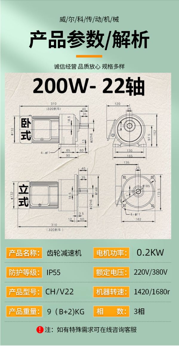 功率有: 100W(0.1KW減速機)、200W(0.2KW減速機)、400W(0.4KW減速機)、750W(0.75KW減速機)、1500W(1.5KW減速機)、2200W(2.2KW減速機)、3700W(3.7KW減速機)......